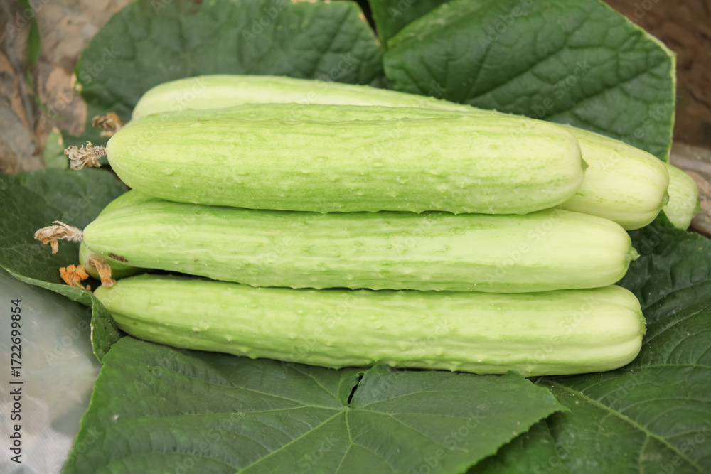 Fresh White Jade Cucumbers on Green Leaves - Organic Greenhouse Vegetable Harvest