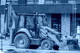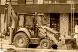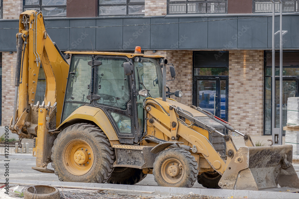 A wheeled excavator is parked at the construction site of an apartment building on an autumn day