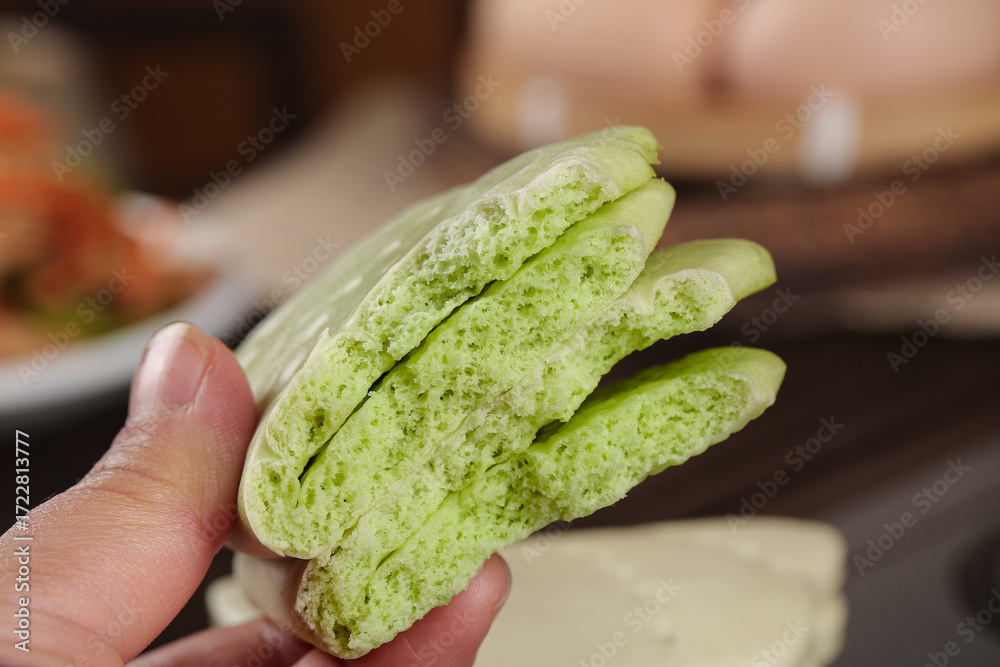 Green Matcha Pandan Bread Slices Showing Soft Fluffy Texture in Hand