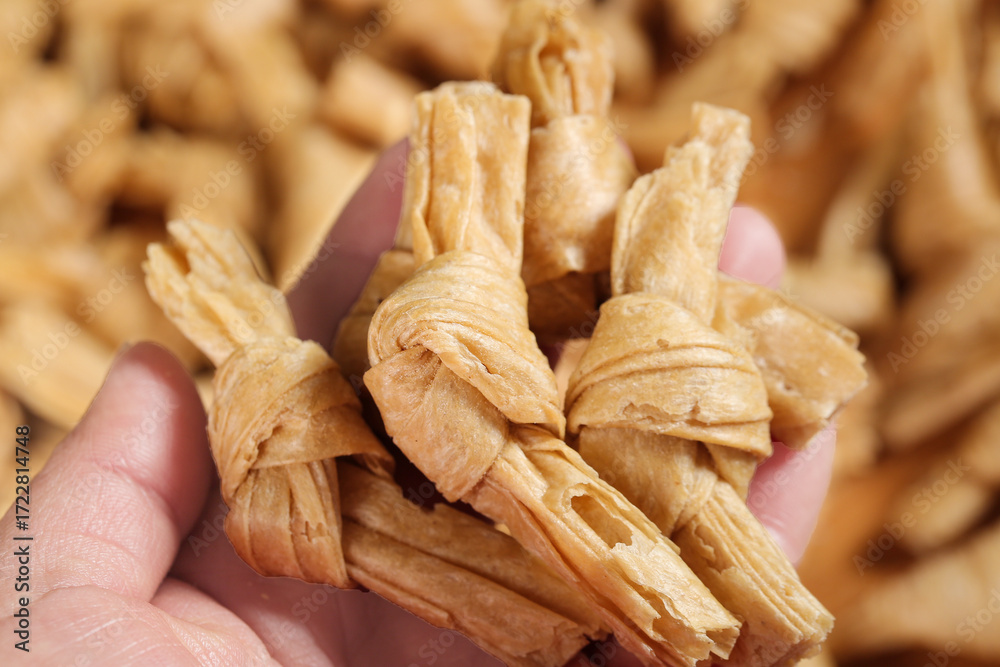 Dried Tofu Skin Knots in Hand - Traditional Asian Vegetarian Protein Ingredient