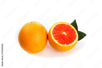 Fresh Red Grapefruit Citrus Fruit Whole and Half Cut with Green Leaf on White Background