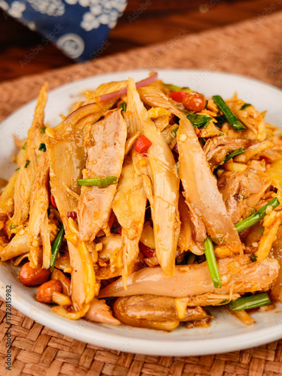Stir-fried bamboo shoots with vegetables on white plate - traditional Asian dish with shallow depth of field