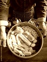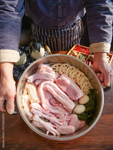 Chef Preparing Raw Pork Belly and Chicken Feet in Traditional Steamer Basket for Asian Cuisine Cooking