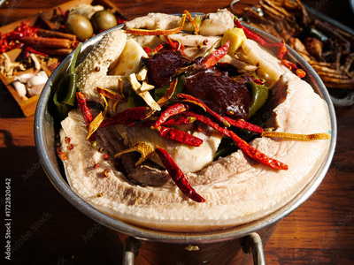 Marinated Duck Hot Pot with Chili Peppers and Vegetables - Traditional Asian Cuisine Delicacies