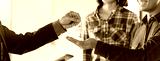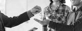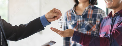 close up view hand of property realtor landlord giving key house to buyer tenant. banner wide side.