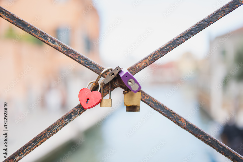 Colorful locks of love hanging on a bridge over a canal in Venice, Italy, showcasing romantic sentiments and beautiful craftsmanship