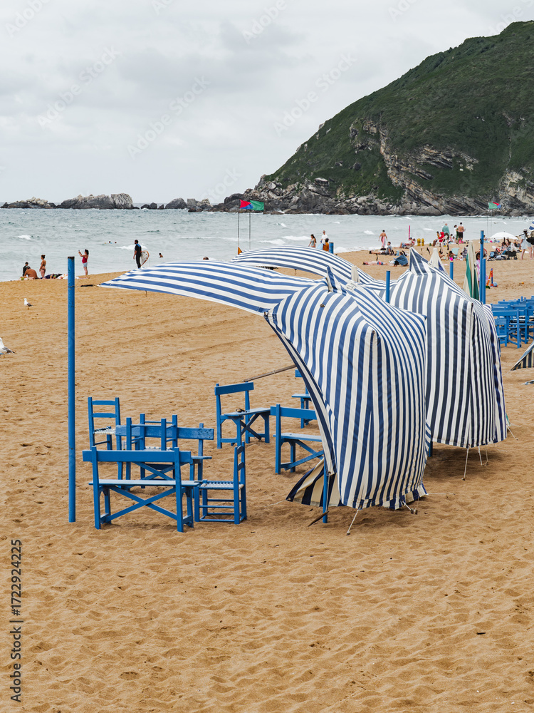 Colorful striped umbrellas and blue chairs at a sandy beach with people enjoying the day by the ocean