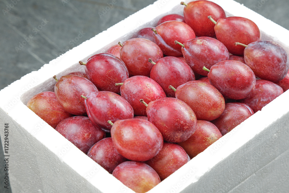 Fresh Red Plums in White Container Ready for Market Distribution