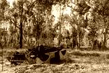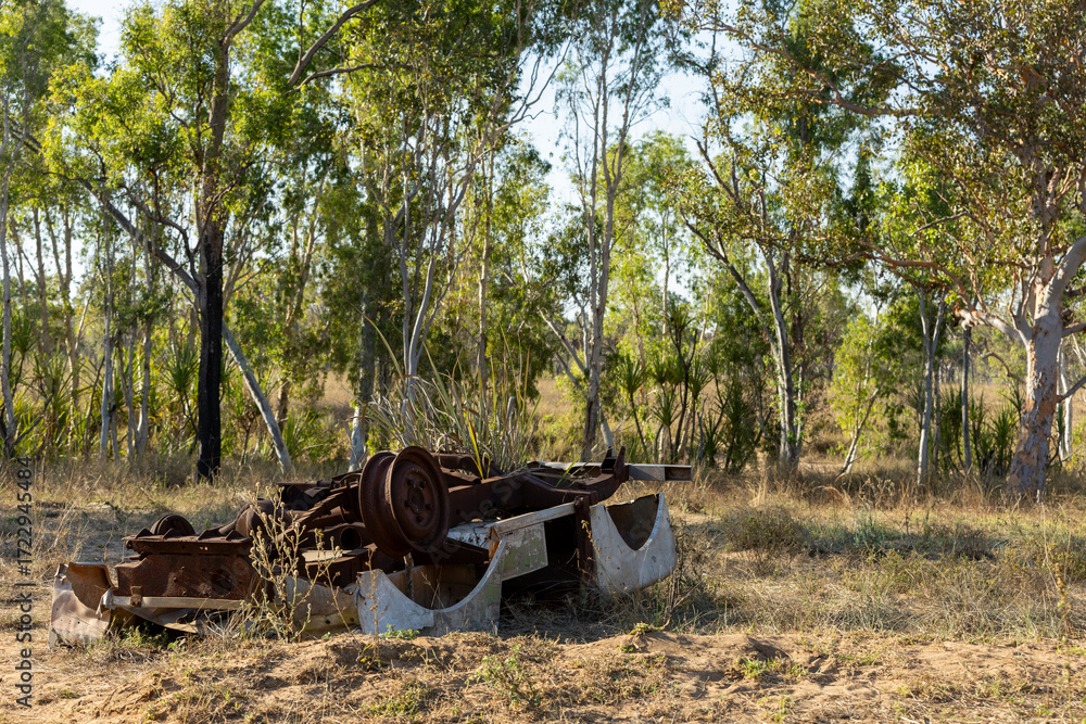 An old car in the Australian bush, rusting and abandoned.
