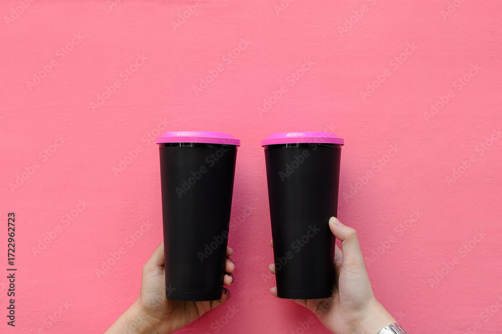 A Duo of Refreshment: Two black tumblers with vibrant pink lids, artfully presented against a cheerful pink backdrop. It's an invitation to savor the moment.