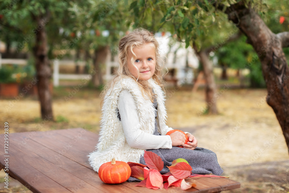 Adorable Little girl having fun sit in the backyard of a house with orange pumpkins. Harvesting. Autumn vegetables. Thanksgiving Day. Happy child playing in autumn park. Family time at Halloween.