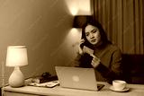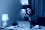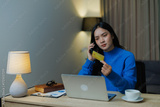 Young woman looking worried while making a phone call, holding her credit card, and having her laptop open on a desk, dealing with an online fraud situation in a home office at night