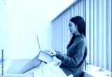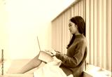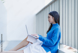 Young Asian woman sitting on the floor wearing a blue sweater and white skirt, looking at a laptop and typing on the keyboard, representing remote work, studying, and freelance concepts
