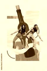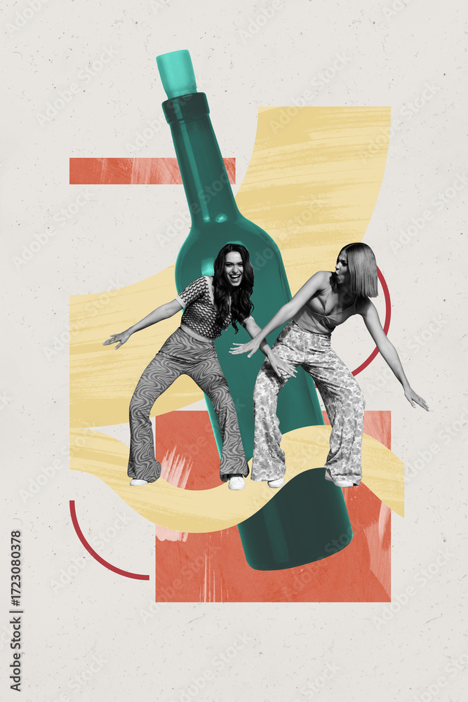 3d poster image vertical pop art collage of happy girl guy stand wine bottle beverage celebration event chill occasion alcohol pub