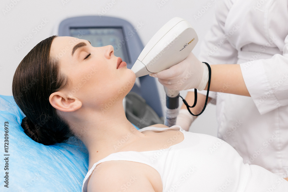 Woman undergoing laser hair removal treatment in a cosmetology clinic, with a professional technician using advanced equipment for effective hair removal process