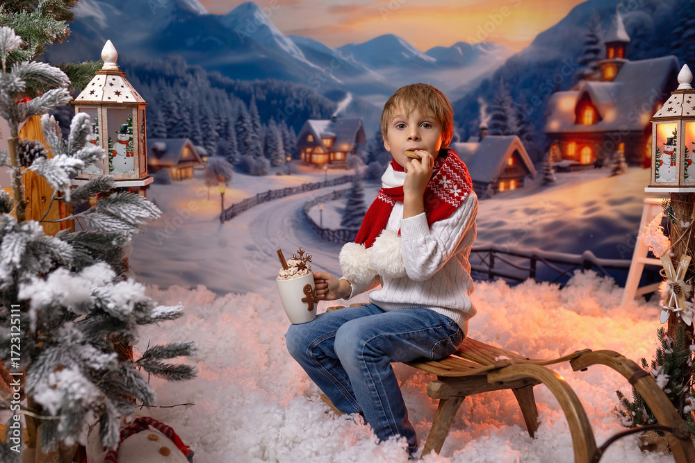Cute white child, blond boy,, sitting on a sledge in the snow, outdoors, sunset in the mountains