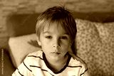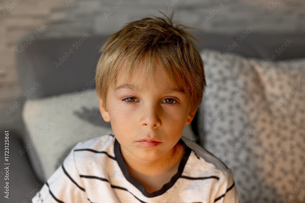 Preschool child, sweet boy with alergic reaction and swollen eye from bite