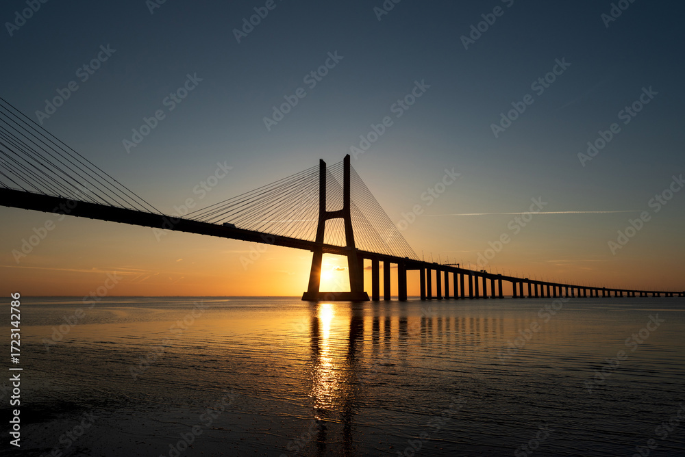 Sunrise Over Vasco da Gama Bridge Spanning the Tagus River in Lisbon, Portugal