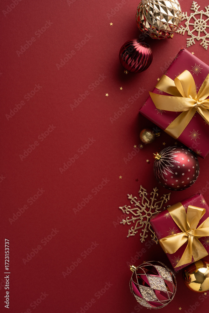Colorful vertical presents with gold ribbon and holiday ornaments on a rich red backdrop, evoking warmth, family, and festive greeting for Christmas and New Year celebrations