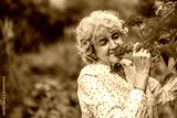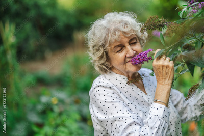 Portrait of elderly woman smelling Buddleja flowers in the garden