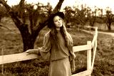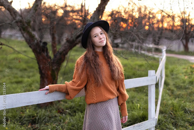 Stylish smiling teen girl in a orange sweater, skirt and hat stand at old wooden fence in fall garden. Outdoor portrait of beautiful young fashionable girl in knitted clothes walking street in park.