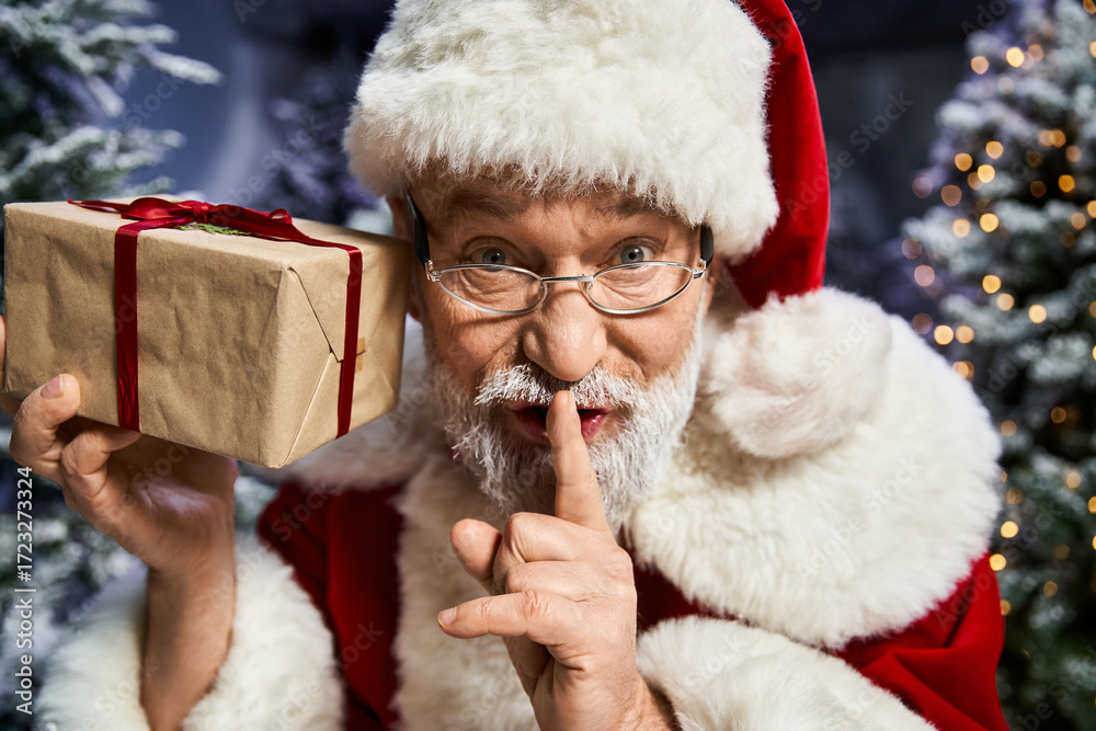 Santa holds a gift and gestures to be quiet in a winter wonderland setting