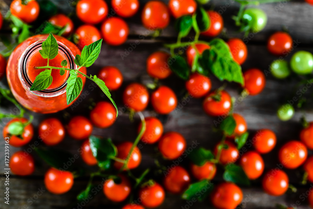 Bottle of tomato juice and fresh tomatoes, healthy food, organic diet concept, overhead