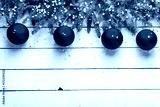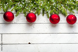 Festive christmas border with red balls on fir branches and snowflakes on white wooden background
