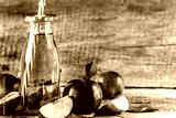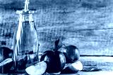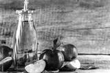 Fresh apple juice on table, bottle of drink and fresh apples on wood, organic food, and healthy lifestyle concept