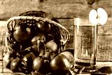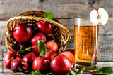 Delicious apple juice in a cup and red apples on wooden table, organic food and healthy lifestyle concept