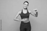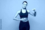 Young fitness trainer instructor woman sportsman wears red sportswear training in home gym hold energy protein bar put hand on belly isolated on plain blue background. Workout sport fit abs concept.