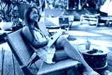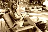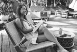 Cheerful young woman journaling in notebook at sunny tropical resort, surrounded by potted plants, handcrafted decor, and refreshing drink