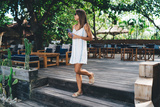 Confident digital nomad walking down wooden stairs holding smartphone, embracing remote lifestyle and freedom of working from anywhere with style and mobility