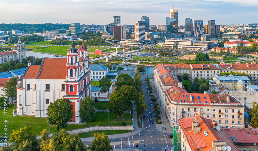 Aerial view of the Church of Saints Philip and James in front of Vilnius CBD, the capital city of Lithuania in the Baltic States