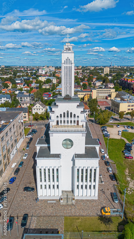 Aerial view of Christ's Resurrection Church on Žaliakalnis (Green Hill) in Kaunas, Lithuania - Functionalist and art deco-style basilica in the Baltic States
