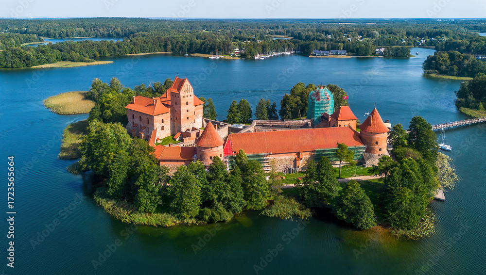 Aerial view of the Trakai Island Castle on Lake Galvė near Vilnius in Lithuania, one of the Baltic States