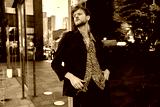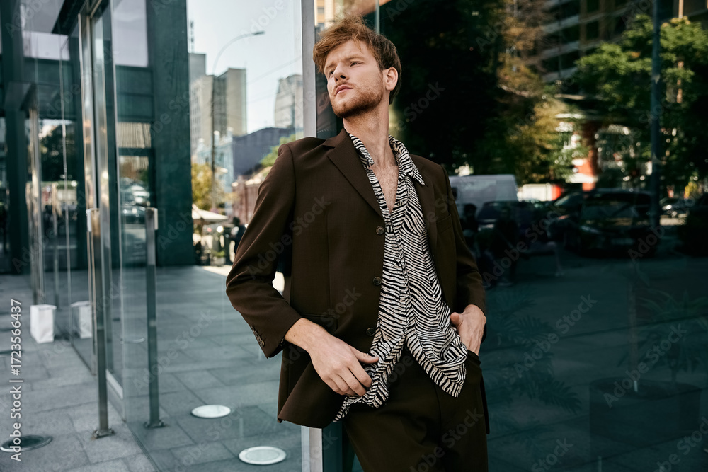 Stylish redhead man in trendy autumn outfit poses confidently in urban setting