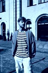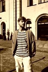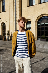 Young redhead man showcases stylish autumn fashion in urban city scene
