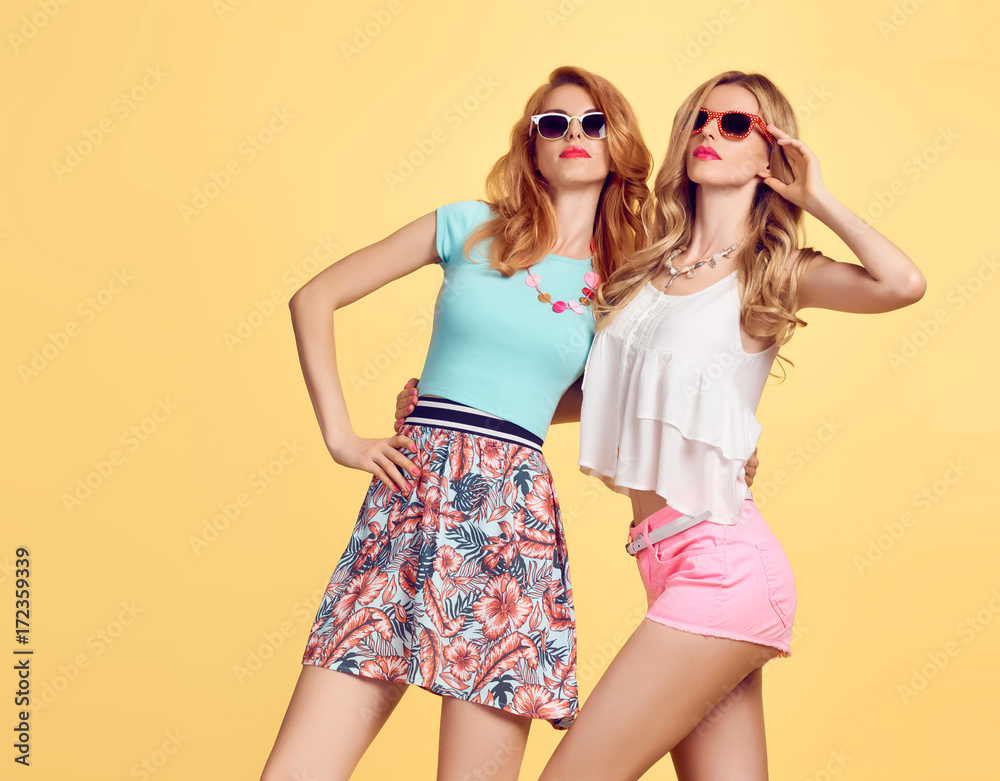 Fashion. Young Woman Having Fun. Sisters Best Friends Twins Crazy. Hipster in Stylish Outfit. Happy Pretty Girl in fashion Stylish Summer sunglasses, Trendy Hairstyle. Playful Cool Model Smiling