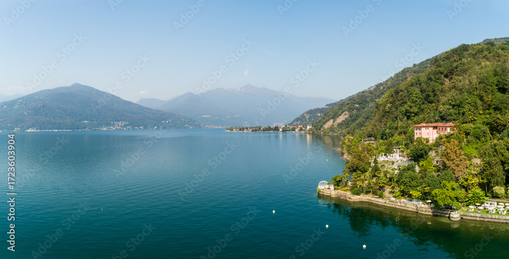 Aerial landscape of Lake Maggiore and Colmegna village, Luino, Lombardy, Italy