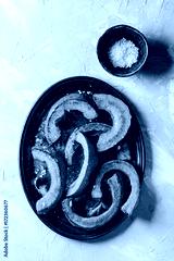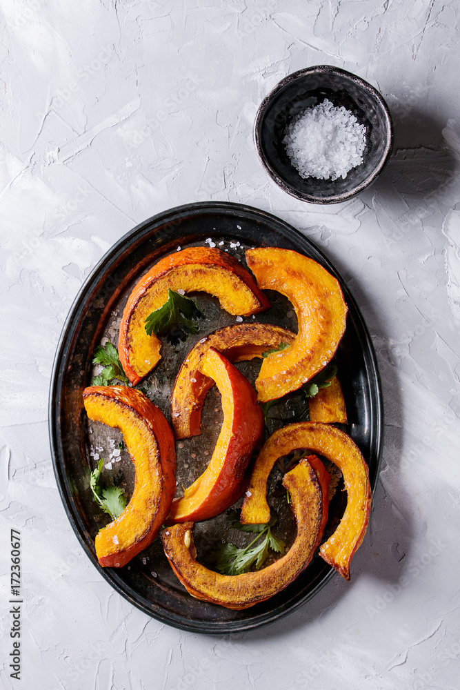Roasted sliced pumpkin with greens and sea salt. Served on vintage metal tray over gray concrete texture background. Top view with space