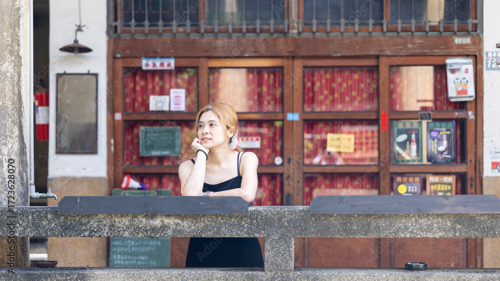 woman take a break and wait someone in front of the old fashioned coffee shop