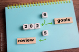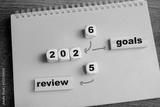 Review past year 2025 to new goals 2026 on stacked wooden cubes on the table. Business and finance concept