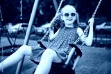 Happy 6 years old girl on a swing. Happy kid on playground swinging on seesaw. Outdoor summer activities for children.