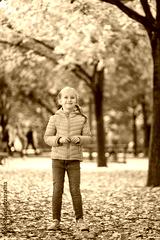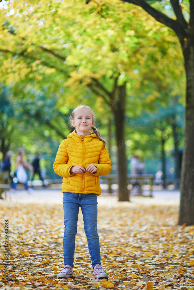Cheerful little girl enjoying her walk in autumn park in Paris, France.