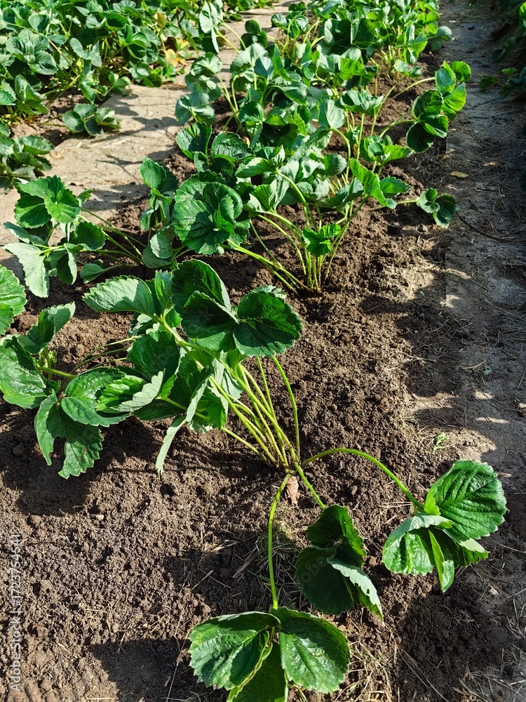 Strawberries grow in a bed, with runners planted in the fall for a new harvest. The delicious berries are grown using organic farming. Отправить отзыв