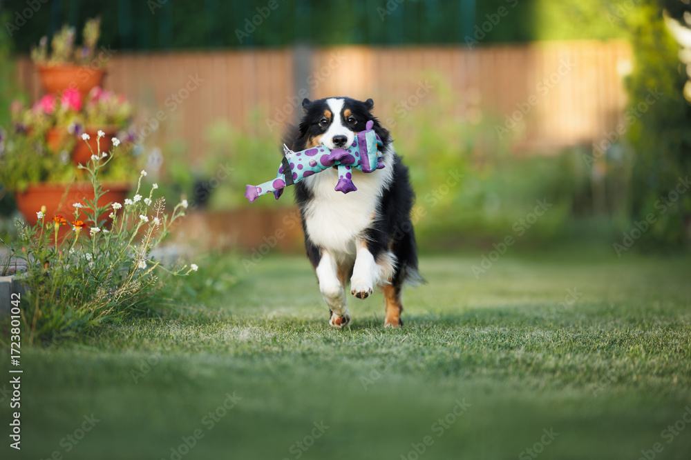 happy miniature american shepherd dog running with a toy outdoors in summer