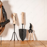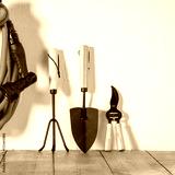 Wooden table with gardening tools with white wall background. Seasonal gardening, outdoor yard work, and autumn clean-up activities, gardening, countryside living, home maintenance, seasonal chores.