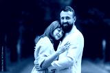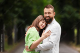 Making marriage proposal. Woman showing engagement ring and hugging her fiance outdoors