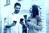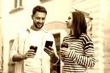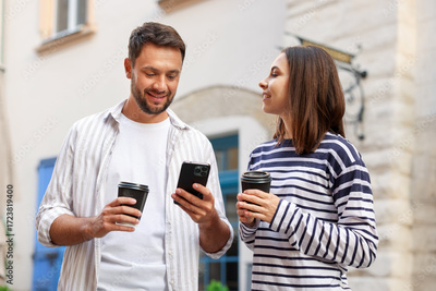 Coffee to go. Couple with paper cups of drinks and smartphone on city street
